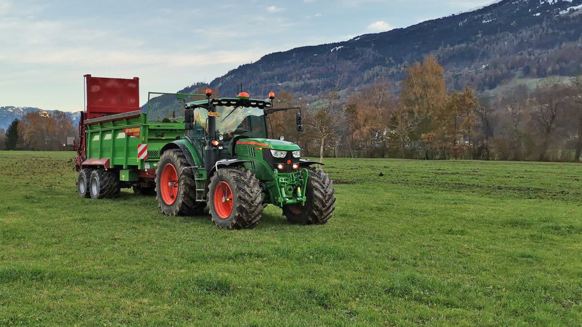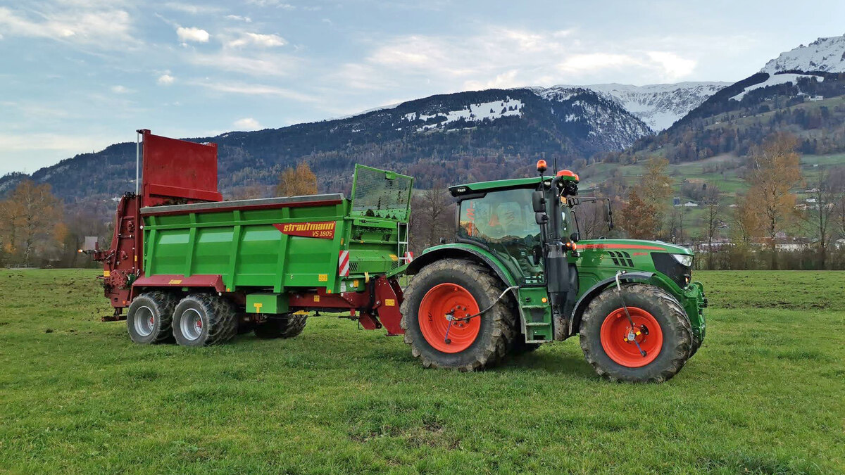 Eine genaue Ausbringung mit perfektem Streubild jeglicher Streugüter ist mit dem Strautmann Universalstreuer kein Problem. Für die Beladung steht ein Radlader mit Teleskop zur Verfügung.