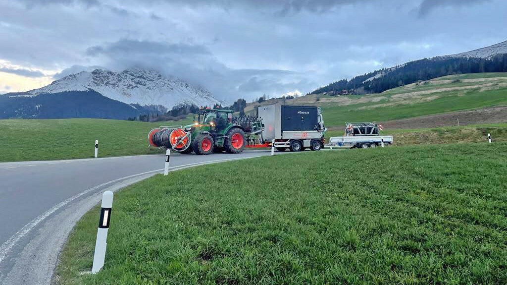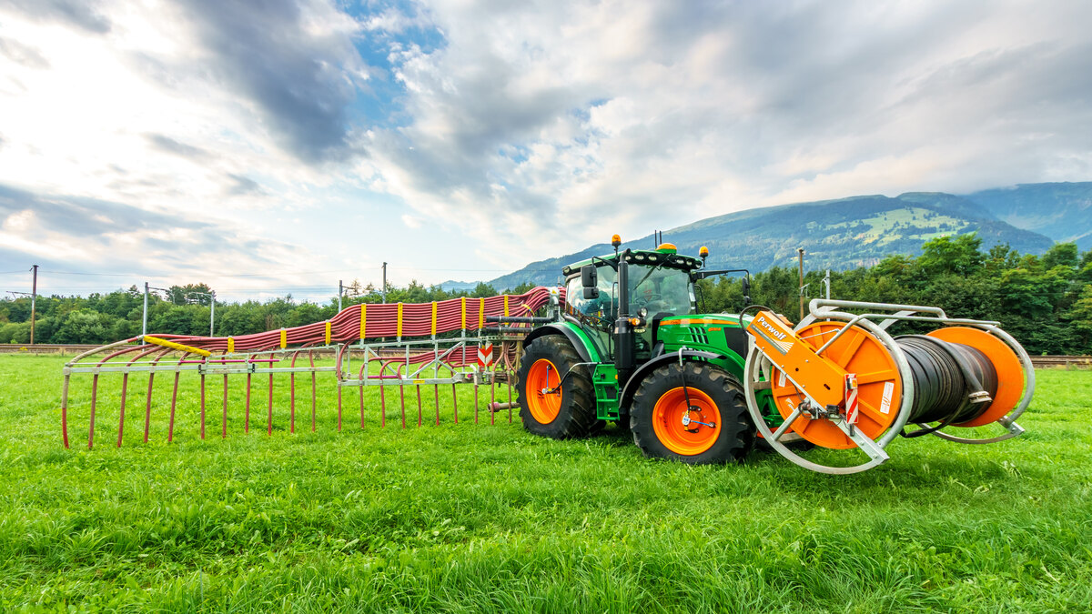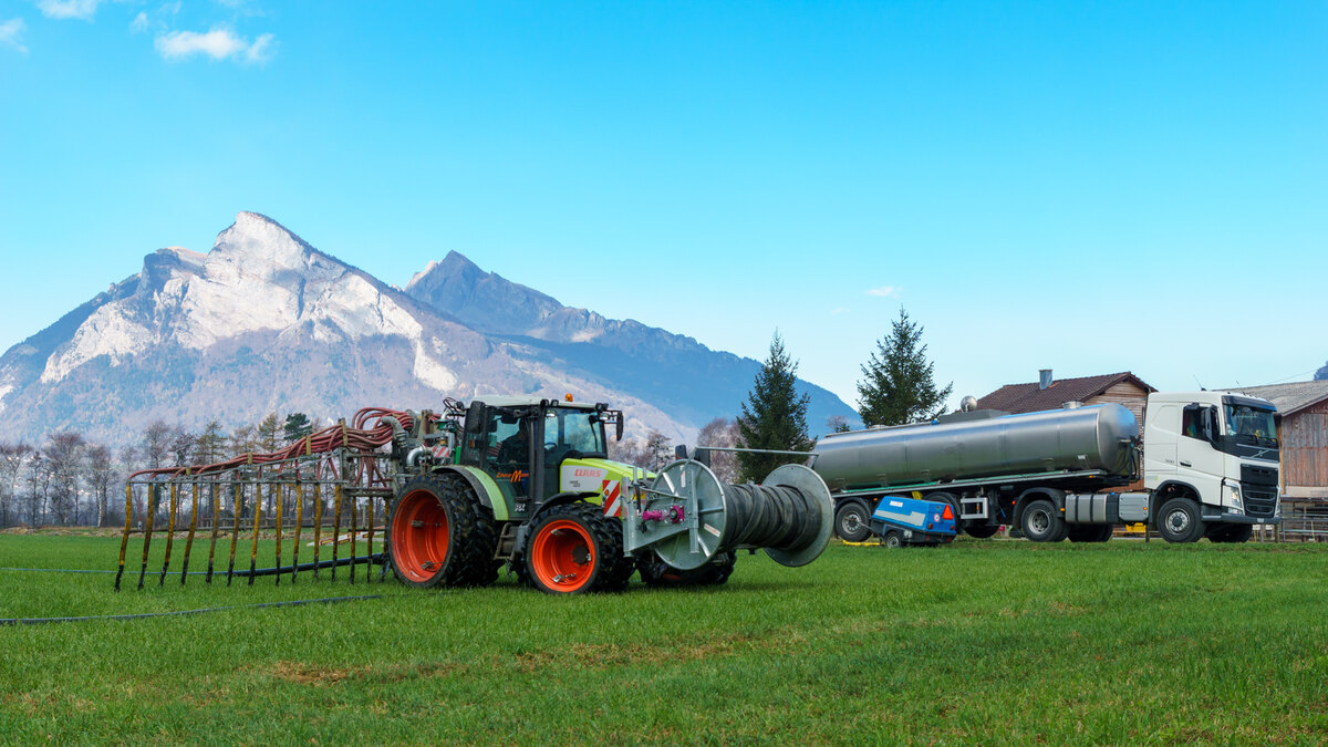 Im Talgebiet bringen wir die Gülle mit unserem 15m Schleppschlauchverteiler, welcher mit modernster Technik ausgestattet ist aus. Mit über 1000m Schlauch, zwei Schlauchhaspeln, Schlauchbrücken und der Güllenpumpe bringen wir die Nährstoffe punktgenau aufs Feld. Dank GPS und Durchflusszähler mit entsprechender Anzeige, kann die von ihnen gewünschte Menge Gülle pro Hektar verteilt werden.