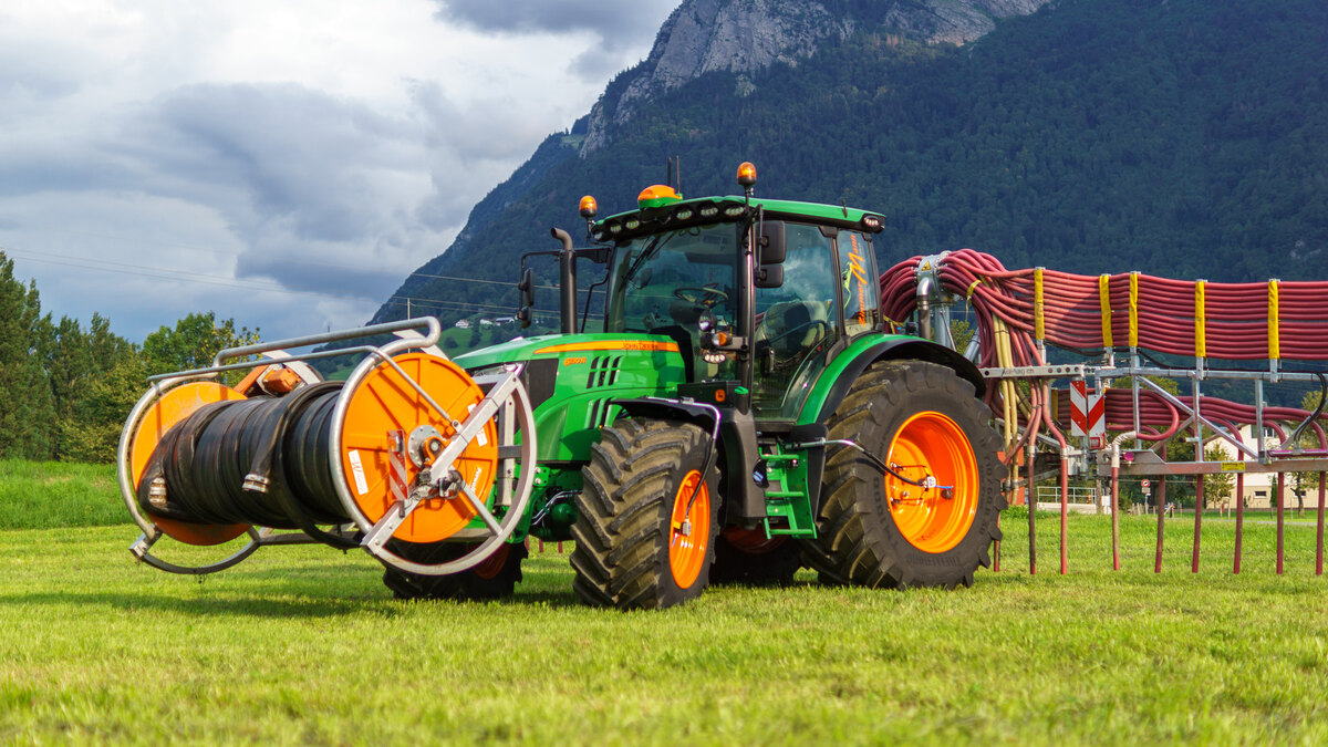 Traktor ausgerüstet mit Breitreifen, Reifendruckregelanlage, GPS und Durchfusszähler mit einem 15m Schleppschlauchgestänge.